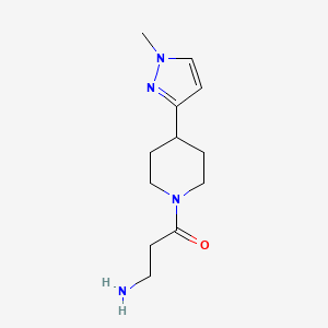 3-amino-1-(4-(1-methyl-1H-pyrazol-3-yl)piperidin-1-yl)propan-1-one plays a significant role in various biochemical reactions. It interacts with several enzymes and proteins, influencing their activity. For instance, it has been observed to inhibit certain kinases, which are enzymes that transfer phosphate groups from high-energy donor molecules to specific substrates. This inhibition can affect signaling pathways within cells, leading to altered cellular responses. Additionally, the compound can bind to specific receptors on cell surfaces, modulating their activity and influencing downstream signaling cascades.