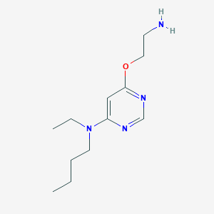 6-(2-aminoethoxy)-N-butyl-N-ethylpyrimidin-4-amine plays a significant role in various biochemical reactions. It interacts with several enzymes, proteins, and other biomolecules. For instance, it has been shown to act as a spacer/linker in the synthesis of bioconjugate materials, which are used in drug delivery and protein labeling. Additionally, it is employed as a receptor chain in the preparation of carboxamidoquinoline-based water-soluble, ratiometric fluorescent zinc sensors. These interactions highlight the compound’s versatility in biochemical applications.