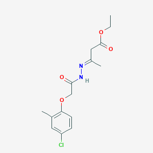 The mechanism of action of ethyl 3-{[(4-chloro-2-methylphenoxy)acetyl]hydrazono}butanoate involves its interaction with specific molecular targets. The hydrazono group can form hydrogen bonds and interact with enzymes or receptors, potentially inhibiting their activity. The phenoxy group may also contribute to the compound’s binding affinity and specificity.