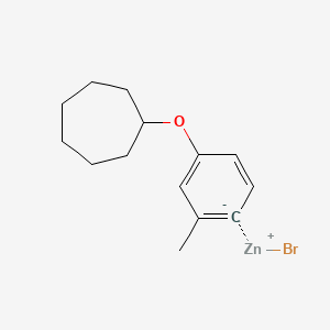 The preparation of 4-CYCLOHEPTYLOXY-2-METHYLPHENYLZINC BROMIDE typically involves the reaction of 4-CYCLOHEPTYLOXY-2-METHYLPHENYL BROMIDE with zinc in the presence of THF. The reaction is carried out under an inert atmosphere, usually nitrogen or argon, to prevent oxidation. The zinc reagent is often activated by treatment with a small amount of iodine or a similar activator to enhance its reactivity.