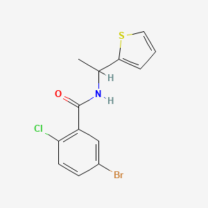 The synthesis of 5-Bromo-2-chloro-N-(1-(thiophen-2-yl)ethyl)benzamide typically involves multi-step reactions. One common method includes the bromination and chlorination of a benzamide precursor, followed by the introduction of the thiophene moiety. The reaction conditions often involve the use of brominating and chlorinating agents such as bromine and thionyl chloride, respectively. The thiophene ring can be introduced through a coupling reaction using thiophene-2-carboxylic acid or its derivatives .