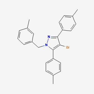 The synthesis of 4-bromo-1-(3-methylbenzyl)-3,5-bis(4-methylphenyl)-1H-pyrazole can be achieved through various synthetic routes. One common method involves the reaction of 4-bromoacetophenone with 3-methylbenzylamine and 4-methylbenzaldehyde in the presence of a base such as potassium carbonate. The reaction typically proceeds under reflux conditions in a suitable solvent like ethanol or methanol. The resulting product is then purified through recrystallization or column chromatography.