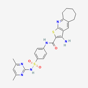 The synthesis of 3-Amino-N-(4-(N-(4,6-dimethylpyrimidin-2-yl)sulfamoyl)phenyl)-6,7,8,9-tetrahydro-5H-cyclohepta[b]thieno[3,2-e]pyridine-2-carboxamide involves several steps. The synthetic route typically starts with the preparation of the core structure, followed by the introduction of various functional groups. Reaction conditions such as temperature, solvents, and catalysts play a crucial role in the efficiency and yield of the synthesis. Industrial production methods may involve optimization of these conditions to achieve large-scale synthesis with high purity and yield .