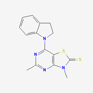7-(2,3-dihydro-1H-indol-1-yl)-3,5-dimethyl[1,3]thiazolo[4,5-d]pyrimidine-2(3H)-thione is a complex heterocyclic compound that incorporates both indole and thiazolopyrimidine moieties. These structures are known for their significant biological activities and are often found in various pharmacologically active compounds. The presence of the indole nucleus, in particular, is associated with a wide range of biological activities, including antiviral, anticancer, and anti-inflammatory properties .