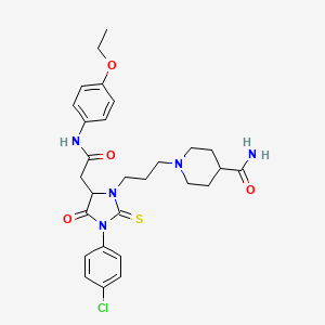 1-(3-{3-(4-CHLOROPHENYL)-5-[2-(4-ETHOXYANILINO)-2-OXOETHYL]-4-OXO-2-THIOXO-1-IMIDAZOLIDINYL}PROPYL)-4-PIPERIDINECARBOXAMIDE is a complex organic compound with potential applications in various scientific fields. This compound is characterized by its unique structure, which includes a chlorophenyl group, an ethoxyanilino group, and an imidazolidinyl group, among others. The presence of these functional groups contributes to its diverse chemical reactivity and potential biological activities.