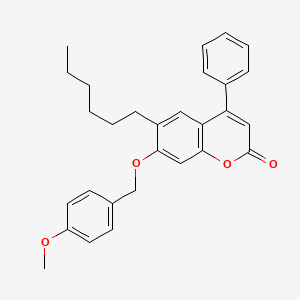 6-Hexyl-7-[(4-methoxybenzyl)oxy]-4-phenyl-2H-chromen-2-one is a synthetic coumarin derivative with the molecular formula C₂₉H₃₀O₄ (molecular weight: 442.555 g/mol) . Its IUPAC name reflects its substitution pattern: a hexyl chain at position 6 of the coumarin core, a 4-methoxybenzyloxy group at position 7, and a phenyl group at position 2. The compound is registered under multiple identifiers, including CAS numbers (e.g., AGN-PC-0KAQ2V) and ChemSpider ID 1499843 .