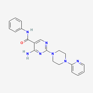 The synthesis of 4-amino-N-phenyl-2-[4-(pyridin-2-yl)piperazin-1-yl]pyrimidine-5-carboxamide typically involves multi-step organic reactions. The process often starts with the preparation of the pyrimidine core, followed by the introduction of the piperazine and phenyl groups. Common reagents include pyridine, piperazine, and various amines. Reaction conditions may involve the use of catalysts, solvents, and controlled temperatures to ensure the desired product yield.