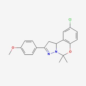 The mechanism of action of 9-Chloro-2-(4-methoxyphenyl)-5,5-dimethyl-1,10b-dihydropyrazolo[1,5-c][1,3]benzoxazine involves its interaction with specific molecular targets and pathways. This compound may bind to enzymes or receptors, modulating their activity and leading to various biological effects. The exact molecular targets and pathways can vary depending on the specific application and context.