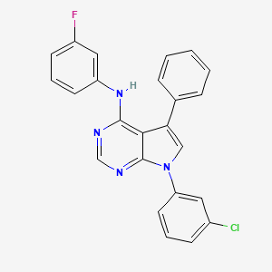 The mechanism of action of 7-(3-chlorophenyl)-N-(3-fluorophenyl)-5-phenyl-7H-pyrrolo[2,3-d]pyrimidin-4-amine involves its interaction with specific molecular targets, such as enzymes or receptors. The compound can modulate the activity of these targets, leading to various biological effects. The exact pathways and molecular interactions depend on the specific application and the biological system being studied.