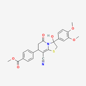 The synthesis of methyl 4-[8-cyano-3-(3,4-dimethoxyphenyl)-3-hydroxy-5-oxo-2,3,6,7-tetrahydro-5H-[1,3]thiazolo[3,2-a]pyridin-7-yl]benzoate typically involves multiple steps, starting with the preparation of the thiazolo[3,2-a]pyridine core This can be achieved through a cyclization reaction involving appropriate precursors under controlled conditions