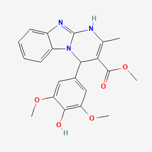 This compound belongs to the dihydropyrimidobenzimidazole class, characterized by a fused pyrimidine-benzimidazole core. Its structure includes a methyl ester at position 3 and a 4-hydroxy-3,5-dimethoxyphenyl substituent at position 4 (Figure 1). The hydroxy and methoxy groups on the phenyl ring contribute to its electronic properties, such as hydrogen-bonding capacity and acidity, while the methyl ester enhances lipophilicity. Such derivatives are synthesized via multi-step reactions involving cyclocondensation and functional group modifications, as outlined in related studies .