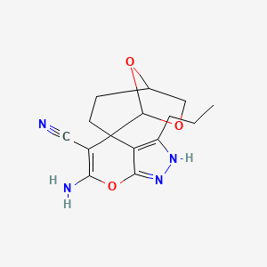 The synthesis of 6’-Amino-3’-propyl-2’H-7,8-dioxaspiro[bicyclo[3.2.1]octane-2,4’-pyrano[2,3-C]pyrazole]-5’-carbonitrile typically involves multicomponent reactions (MCRs). One common method includes the reaction of aldehydes or isatin with malononitrile and β-ketoesters in the presence of a catalyst . The reaction conditions often require a solvent such as dichloromethane and a strong Lewis acid like antimony pentafluoride .