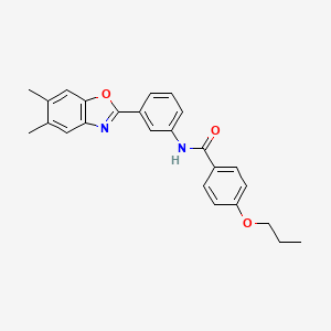 N-[3-(5,6-dimethyl-1,3-benzoxazol-2-yl)phenyl]-4-propoxybenzamide is a complex organic compound that belongs to the benzoxazole family Benzoxazoles are heterocyclic compounds containing a benzene ring fused to an oxazole ring This particular compound is characterized by the presence of a dimethylbenzoxazole moiety attached to a phenyl ring, which is further connected to a propoxybenzamide group