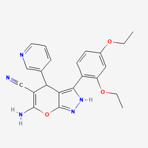 6-AMINO-3-(2,4-DIETHOXYPHENYL)-4-(PYRIDIN-3-YL)-1H,4H-PYRANO[2,3-C]PYRAZOLE-5-CARBONITRILE is a complex organic compound that belongs to the class of pyranopyrazoles. These compounds are known for their diverse biological activities and potential applications in medicinal chemistry. The structure of this compound includes a pyran ring fused with a pyrazole ring, along with various substituents that contribute to its unique chemical properties.