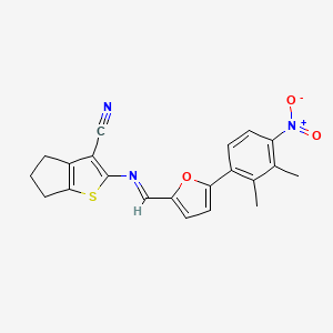 The synthesis of 2-[(E)-{[5-(2,3-DIMETHYL-4-NITROPHENYL)FURAN-2-YL]METHYLIDENE}AMINO]-4H,5H,6H-CYCLOPENTA[B]THIOPHENE-3-CARBONITRILE typically involves multi-step organic reactions. The process begins with the preparation of the furan and thiophene intermediates, followed by their coupling under specific conditions to form the final compound. Common reagents used in these reactions include aldehydes, amines, and various catalysts to facilitate the formation of the desired product.