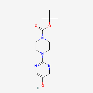 The molecular structure consists of a six-membered piperazine ring containing two nitrogen atoms in the 1,4-positions, with one nitrogen bearing a tert-butyl carboxylate protecting group and the other connected to a 2-pyrimidinyl substituent. The pyrimidine ring features a hydroxyl group at the 5-position, creating a hydroxypyrimidine moiety that significantly influences the compound's chemical properties and potential reactivity patterns. The tert-butyl carboxylate functionality serves as a common protecting group strategy, allowing for selective synthetic transformations while maintaining the integrity of the piperazine core structure.