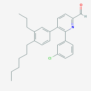 6-(3-Chlorophenyl)-5-(4-hexyl-3-propylphenyl)picolinaldehyde is a substituted picolinaldehyde derivative featuring a 3-chlorophenyl group at the 6-position and a 4-hexyl-3-propylphenyl moiety at the 5-position of the pyridine ring. The hexyl and propyl substituents contribute to its lipophilicity, while the chlorophenyl group introduces steric and electronic effects that influence its chemical behavior.