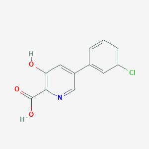 5-(3-Chlorophenyl)-3-hydroxypicolinic acid belongs to the broader classification of substituted picolinic acids, specifically representing a doubly substituted derivative with both aromatic and hydroxyl functionalities. The compound's systematic name, 5-(3-chlorophenyl)-3-hydroxypyridine-2-carboxylic acid, reflects its complex substitution pattern on the picolinic acid backbone. The molecule features a pyridine ring system with three distinct functional groups: a carboxylic acid at position 2, a hydroxyl group at position 3, and a 3-chlorophenyl substituent at position 5.