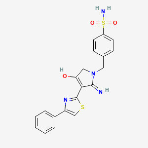 4-{[4-hydroxy-2-imino-3-(4-phenyl-1,3-thiazol-2-yl)-2,5-dihydro-1H-pyrrol-1-yl]methyl}benzenesulfonamide is a complex organic compound with significant potential in medicinal chemistry. This compound features a thiazole ring, a pyrrole ring, and a benzenesulfonamide moiety, making it a subject of interest for various biological activities, including antimicrobial, anti-inflammatory, and anticancer properties.