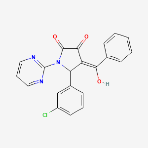 4-benzoyl-5-(3-chlorophenyl)-3-hydroxy-1-(pyrimidin-2-yl)-2,5-dihydro-1H-pyrrol-2-one is a complex organic compound that belongs to the class of heterocyclic compounds. This compound features a pyrrol-2-one core structure, which is substituted with various functional groups, including a benzoyl group, a chlorophenyl group, a hydroxy group, and a pyrimidinyl group. These substitutions confer unique chemical and physical properties to the compound, making it of interest in various fields of scientific research.