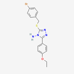 The mechanism of action of 3-[(4-Bromophenyl)methylthio]-5-(4-ethoxyphenyl)-1,2,4-triazole-4-ylamine involves its interaction with specific molecular targets. The compound can bind to enzymes or receptors, inhibiting their activity or modulating their function. The exact molecular targets and pathways involved depend on the specific biological activity being studied. For example, in antimicrobial applications, the compound may inhibit the growth of bacteria or fungi by interfering with their metabolic processes.