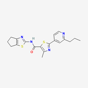 This compound is a substituted thiazole carboxamide featuring a 4-methylthiazole core linked to a 2-propylpyridin-4-yl group at the 2-position and a 5,6-dihydro-4H-cyclopenta[d]thiazol-2-yl amine moiety at the carboxamide position. Its synthesis follows a modular route (Fig. 3 in ), starting with ethyl 4-methyl-2-(4-pyridinyl)thiazole-5-carboxylate intermediates, which are hydrolyzed to carboxylic acids and coupled with amines using classic reagents like HATU or EDCI . The 2-propylpyridinyl substituent and cyclopenta-fused thiazole amine distinguish it from related analogs, suggesting tailored electronic and steric properties for receptor targeting, as implied by the study’s focus on bioactivity against unspecified receptors .