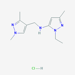 The synthesis of N-[(1,3-dimethylpyrazol-4-yl)methyl]-2-ethyl-5-methylpyrazol-3-amine;hydrochloride typically involves the alkylation of pyrazoles. One common method is the reaction of 3,5-dimethyl-1H-pyrazole with an alkylating agent such as bromomethyl compounds in the presence of a base like potassium tert-butoxide in tetrahydrofuran (THF) at reflux conditions . The resulting product is then further reacted with ethyl and methyl substituents to obtain the desired compound.