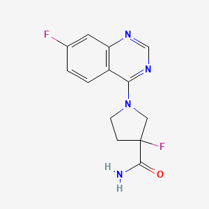 3-Fluoro-1-(7-fluoroquinazolin-4-yl)pyrrolidine-3-carboxamide is unique due to its specific combination of fluorine atoms, quinazoline moiety, and pyrrolidine ring. This unique structure contributes to its distinct biological activity and potential therapeutic applications, setting it apart from other similar compounds .