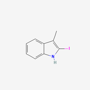 Among the various halogenated indoles, this compound stands out as a particularly valuable synthetic scaffold. The presence of the iodine atom at the 2-position, a less common substitution pattern compared to the 3-position, provides a unique handle for regioselective modifications. This specific arrangement of substituents—an iodo group at C2 and a methyl group at C3—influences the electronic distribution within the indole ring, thereby directing subsequent chemical transformations. The iodine atom, being an excellent leaving group, facilitates a wide range of cross-coupling reactions, enabling the introduction of diverse functionalities at the C2 position. This makes this compound a strategic starting material for the synthesis of highly substituted and complex indole derivatives with potential applications in medicinal chemistry and materials science.