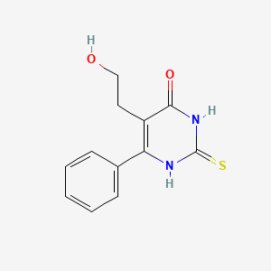 The synthesis of 5-(2-hydroxyethyl)-6-phenyl-2-sulfanylidene-1H-pyrimidin-4-one typically involves multi-step organic reactions. One common method involves the condensation of appropriate aldehydes with thiourea and subsequent cyclization. The reaction conditions often require acidic or basic catalysts and controlled temperatures to ensure the formation of the desired product.