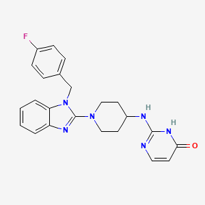 4(1H)-Pyrimidinone, 2-((1-(1-((4-fluorophenyl)methyl)-1H-benzimidazol-2-yl)-4-piperidinyl)amino)- is a complex organic compound that has garnered interest in various fields of scientific research. This compound is characterized by its unique structure, which includes a pyrimidinone core, a benzimidazole moiety, and a piperidine ring. The presence of a fluorophenyl group further adds to its chemical diversity, making it a valuable subject for study in medicinal chemistry, pharmacology, and industrial applications.