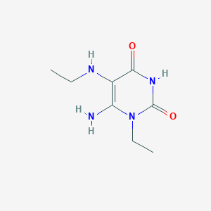 The synthesis of 6-Amino-1-ethyl-5-(ethylamino)-1,2,3,4-tetrahydropyrimidine-2,4-dione typically involves the condensation of ethylurea with ethyl acetoacetate, followed by cyclization under acidic conditions. The optimal reaction conditions include a temperature range of 50-70°C and a slightly acidic pH, ensuring efficient ring closure.