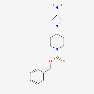 Benzyl 4-(3-aminoazetidin-1-yl)piperidine-1-carboxylate belongs to the class of heterocyclic organic compounds characterized by the presence of multiple nitrogen-containing ring systems. The compound's systematic nomenclature follows International Union of Pure and Applied Chemistry conventions, with the official name being benzyl 4-(3-amino-1-azetidinyl)-1-piperidinecarboxylate. This nomenclature reflects the structural hierarchy where the piperidine ring serves as the central scaffold, with the azetidine substituent attached at the 4-position and the benzyl carboxylate group connected to the piperidine nitrogen.