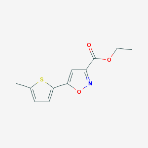 Ethyl 5-(5-methylthiophen-2-yl)isoxazole-3-carboxylate is a heterocyclic compound featuring an isoxazole ring substituted at the 5-position with a 5-methylthiophen-2-yl group and at the 3-position with an ethyl carboxylate moiety. This structure combines the electron-rich thiophene ring with the isoxazole scaffold, which is often explored in medicinal chemistry for its bioisosteric properties and metabolic stability . The compound’s synthesis typically involves cycloaddition reactions between appropriately substituted oximes and alkynes, as seen in related isoxazole derivatives .