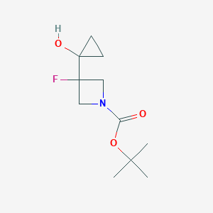 The mechanism of action of tert-butyl 3-fluoro-3-(1-hydroxycyclopropyl)azetidine-1-carboxylate involves its interaction with specific molecular targets and pathways. The fluorinated azetidine ring and hydroxycyclopropyl moiety contribute to its reactivity and binding affinity. The compound can interact with enzymes, receptors, and other biomolecules, modulating their activity and leading to various biological effects .