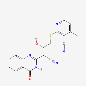 The mechanism of action of 2-{[3-cyano-2-oxo-3-(4-oxo-3,4-dihydro-2(1H)-quinazolinylidene)propyl]sulfanyl}-4,6-dimethylnicotinonitrile involves its interaction with specific molecular targets. These targets may include enzymes, receptors, or other proteins. The compound’s quinazoline moiety is known to interact with kinase enzymes, potentially inhibiting their activity and affecting cell signaling pathways. Additionally, the nicotinonitrile core may interact with nucleic acids or other biomolecules, further influencing its biological activity.