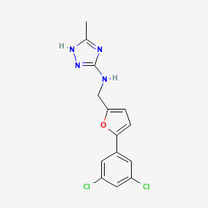 The synthesis of N-{[5-(3,5-dichlorophenyl)-2-furyl]methyl}-3-methyl-1H-1,2,4-triazol-5-amine typically involves multiple steps. One common method starts with the preparation of the 3,5-dichlorophenyl-2-furylmethanol intermediate. This intermediate is then reacted with 3-methyl-1H-1,2,4-triazol-5-amine under specific conditions to yield the final product. The reaction conditions often include the use of solvents like dichloromethane or ethanol and catalysts such as triethylamine to facilitate the reaction.