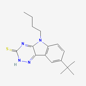 The synthesis of 5-butyl-8-tert-butyl-5H-[1,2,4]triazino[5,6-b]indole-3-thiol involves the condensation of tert-butyl-substituted isatins with benzene-1,2-diamine or thiosemicarbazide. The reaction is typically carried out under reflux conditions in the presence of a suitable solvent, such as ethanol or methanol. The reaction mixture is then cooled, and the product is isolated by filtration and purified by recrystallization .