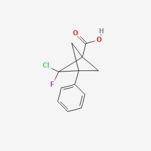 The mechanism of action of 2-chloro-2-fluoro-3-phenylbicyclo[1.1.1]pentane-1-carboxylic acid involves its interaction with specific molecular targets. The presence of chlorine and fluorine atoms enhances its binding affinity to certain enzymes and receptors, modulating their activity. The bicyclo[1.1.1]pentane core provides a rigid framework that can influence the compound’s overall conformation and reactivity.
