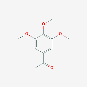 3',4',5'-Trimethoxyacetophenone, a member of the acetophenone (B1666503) class of organic compounds, is a versatile building block in medicinal chemistry and organic synthesis.[1][2] Characterized by an acetophenone core substituted with three methoxy (B1213986) groups at the 3, 4, and 5 positions of the phenyl ring, this compound serves as a crucial precursor for the synthesis of a wide array of biologically active molecules, most notably chalcones with significant therapeutic potential.[1][3] This technical guide provides a comprehensive overview of this compound, including its chemical and physical properties, detailed experimental protocols for its synthesis and the synthesis of its derivatives, spectroscopic data, and an exploration of its role in the development of novel therapeutic agents.