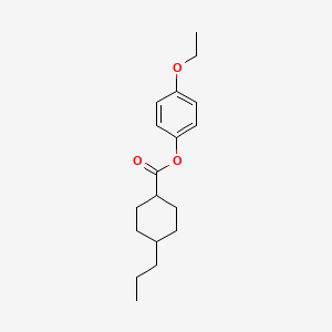 4-Ethoxyphenyl trans-4-propylcyclohexanecarboxylate (CAS 67589-39-3) is a chiral ester derivative with the molecular formula C₁₈H₂₆O₃ and a molecular weight of 290.40 g/mol . Its structure comprises a cyclohexane ring substituted with a propyl group at the trans-4 position and a carboxylate ester linked to a 4-ethoxyphenyl moiety (Figure 1). The stereochemical configuration is defined by the trans orientation of the propyl and carboxylate groups on the cyclohexane ring, which minimizes steric hindrance and stabilizes the chair conformation of the cyclohexane.