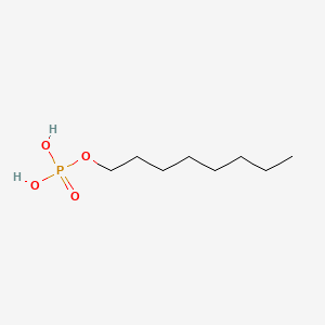 this compound (CAS 3991-73-9) can be synthesized via esterification reactions between phosphoric acid and octanol under controlled conditions. Key steps include acid catalysis, temperature modulation (typically 80–120°C), and inert atmosphere to prevent oxidation. Post-synthesis purification involves solvent extraction, recrystallization, or column chromatography to isolate the monooctyl ester form. Structural confirmation is achieved via FT-IR (P=O and P-O-C stretching bands) and NMR (characteristic shifts for alkyl and phosphate groups) .