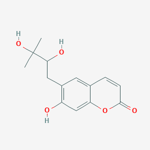 2H-1-Benzopyran-2-one, 6-(2,3-dihydroxy-3-methylbutyl)-7-hydroxy-, commonly referred to as a hydroxycoumarin, is a naturally occurring compound derived from the plant Angelica dahurica. This compound belongs to the coumarin class, which is characterized by a benzopyrone structure. The unique side chain of 2,3-dihydroxy-3-methylbutyl enhances its biological activities, making it a subject of interest in various fields including pharmacology and medicinal chemistry.