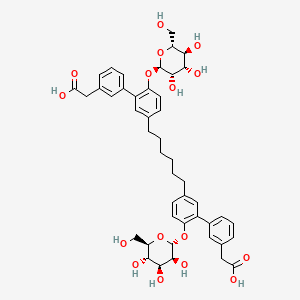 | IUPAC Name | 2-[3-[5-[6-[3-[3-(carboxymethyl)phenyl]-4-[(2R,3S,4S,5S,6R)-3,4,5-trihydroxy-6-(hydroxymethyl)oxan-2-yl]oxyphenyl]hexyl]-2-[(2R,3S,4S,5S,6R)-3,4,5-trihydroxy-6-(hydroxymethyl)oxan-2-yl]oxyphenyl]phenyl]acetic acid | [2] |