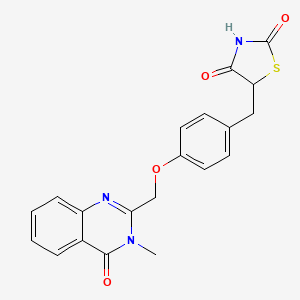 The synthesis of this compound, chemically named 5-({4-[(3-Methyl-4-oxo-3,4-dihydro-2-quinazolinyl)methoxy]phenyl}methyl)-2,4-thiazolidinedione, is a multi-step process that involves the formation of a thiazolidinedione ring and its subsequent coupling with a quinazolinone moiety. The general synthetic route can be outlined in the following key stages: