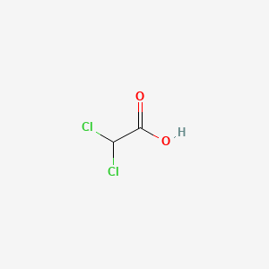This compound is an organochlorine compound comprising acetic acid carrying two chloro substituents at the 2-position. It occurs in nature in seaweed, Asparagopsis taxiformis. It has a role as an astringent and a marine metabolite. It is a monocarboxylic acid and an organochlorine compound. It is functionally related to an acetic acid. It is a conjugate acid of a dichloroacetate.