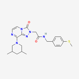 This compound belongs to the triazolo[4,3-a]pyrazine class, characterized by a fused bicyclic core with a triazole ring and pyrazine moiety. The structure includes a 3,5-dimethylpiperidin-1-yl substituent at position 8 and an N-{[4-(methylsulfanyl)phenyl]methyl}acetamide group at position 2 (Fig. 1). The 3,5-dimethylpiperidine introduces steric bulk and conformational rigidity, while the 4-(methylsulfanyl)benzyl group contributes hydrophobic and hydrogen-bonding interactions. The molecular formula is inferred as C24H30N6O2S, with a monoisotopic mass of ~498.2 g/mol based on structural analogs .