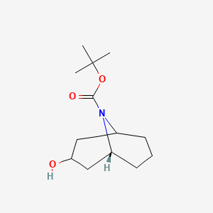 This compound is a bicyclic tertiary amine with a hydroxyl group at the 3-exo position and a tert-butoxycarbonyl (Boc) protecting group. Its IUPAC name reflects its stereochemistry (3-exo) and functionalization: the bicyclo[3.3.1]nonane scaffold contains a nitrogen atom (aza) at position 9, a hydroxyl group at position 3, and a Boc ester. The Boc group enhances solubility and stability, making it valuable in medicinal chemistry for peptide synthesis and drug intermediate applications . Its CAS number is 934233-73-5, and it is supplied by multiple vendors, often with >95% purity .