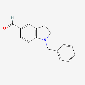 The direct N-benzylation of indoline-5-carbaldehyde is a straightforward and commonly employed method. This nucleophilic substitution reaction is typically carried out using benzyl chloride or benzyl bromide in the presence of a base such as potassium carbonate. The choice of solvent is also critical, with polar aprotic solvents like a mixture of acetonitrile (B52724) and DMF often used to facilitate the reaction. Optimization of reaction parameters such as temperature and reaction time is crucial to maximize the yield and minimize side reactions.
