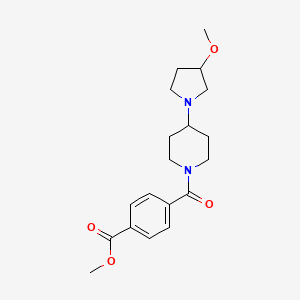 The synthesis of Methyl 4-[4-(3-methoxypyrrolidin-1-yl)piperidine-1-carbonyl]benzoate involves multiple steps. One common synthetic route includes the formation of the pyrrolidine and piperidine rings, followed by their functionalization and coupling with benzoate. The reaction conditions typically involve the use of organic solvents, catalysts, and controlled temperatures to ensure the desired product yield .